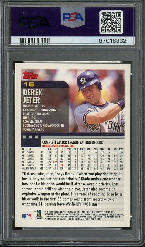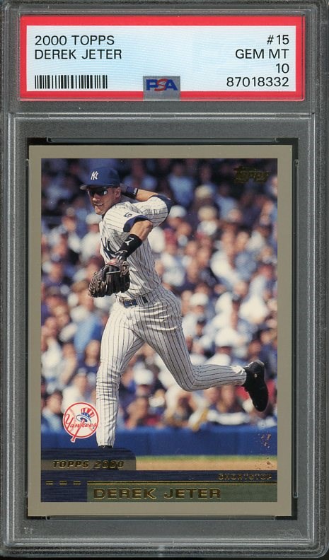 2000 Topps Derek Jeter #15 PSA Gem Mint 10. A tougher than average PSA 10 due to the gray border design by Topps in 2000. Of all the Yankee greats, Jeter holds the team record for most hits with 3,465.