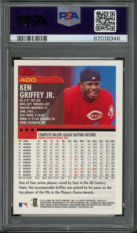 2000 Topps Ken Griffey, Jr. #400 (HOF) PSA Gem Mint 10. Card was recently graded and comes in a new PSA holder.