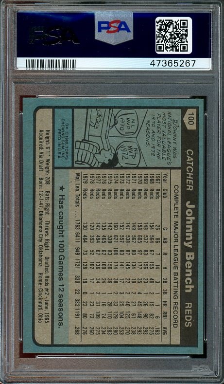 1980 Topps Johnny Bench #100 PSA Mint 9 - A mint Johnny Bench card at an affordable price. Bench won two World Series titles, two league MVP's and a World Series MVP. He was a fourteen time all-star and was elected to the Hall of Fame in 1989. Minimum bid starts out at just $25.