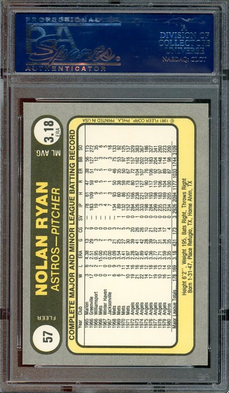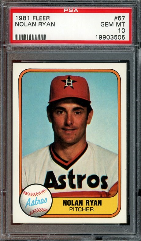 1981 Fleer Nolan Ryan #57  PSA Gem Mint 10 - 1981 Fleer had printing and centering issues, thus PSA 10's are a bit tough to come by. This card is free of any flaws and comes in a scratch free PSA holder.