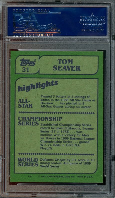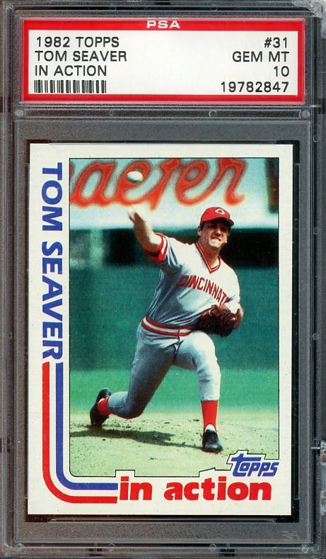 1982 Topps Tom Seaver IA #31 PSA Gem Mint 10 - Here is the 1982 Topps "In Action" card of Seaver. The card received a Gem Mint 10 grade by PSA and comes in a scratch free holder.