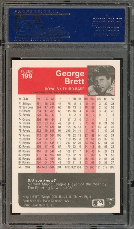 1985 Fleer George Brett #199  PSA Gem Mint 10 - The Royals and Brett won the World Series in 1985 making this Fleer issue extra special.  Card comes in a scratch free PSA holder.