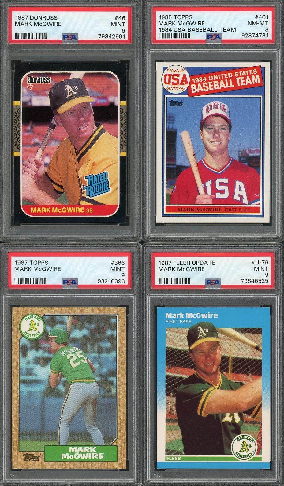 Mark McGwire Lot of 4 PSA Graded, 1985 Topps RC #401 PSA 8, 1987 Donruss Rated Rookie #46 PSA 9, 1987 Fleer Update #U-76 PSA 9, and 1987 Topps #366 PSA 9. Get all four great McGwire cards in one lot!