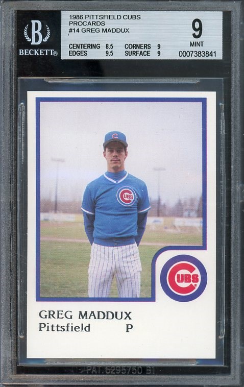 1986 Pittsfield Cubs Greg Maddux #14  BGS Mint 9 - This tough pre-rookie card of Maddux has a low population, especially in Mint 9 grade. (BGS pop of only 60)