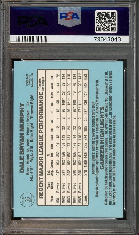 1986 Donruss Dale Murphy #66  PSA Gem Mint 10 - This is a low pop card in PSA 10 grade.  Murphy cards have a lot of potential if he gets inducted in the HOF some day.