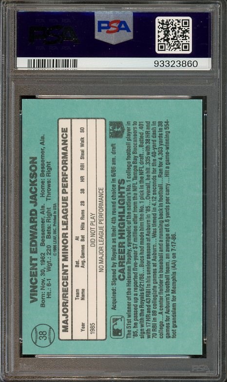 Lot # 322: 1986 Donruss The Rookies Bo Jackson RC #38 PSA Mint 9