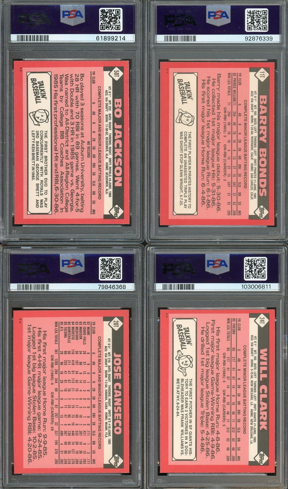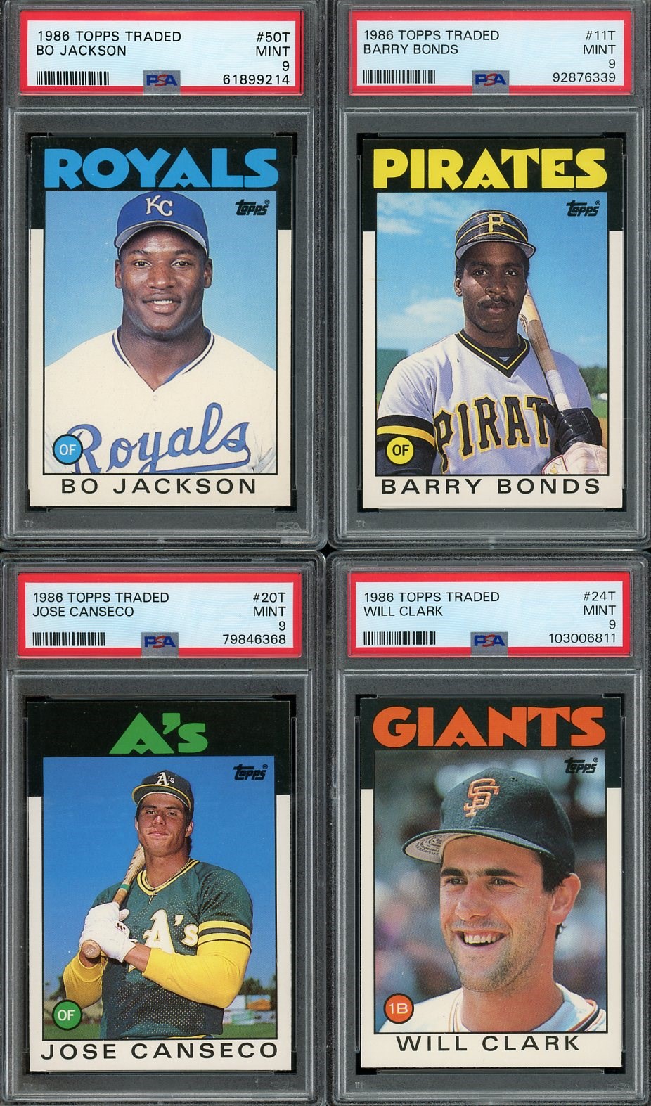 1986 Topps Traded Rookie Lot with Bo Jackson #50T, Barry Bonds #11T, Jose Canseco #20T and Will Clark #24T All in PSA Mint 9's. Cards and PSA holders are all problem free.