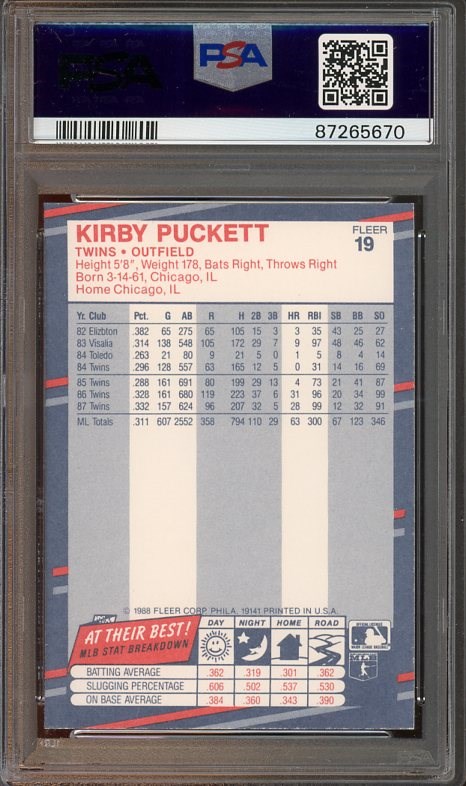 1988 Fleer Kirby Puckett #19 PSA Gem Mint 10 - Not an easy PSA 10 to obtain as the 1988 Fleer's have centering and chipping problems. Here is a great Kirby Puckett card graded PSA 10.
