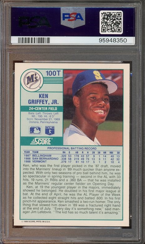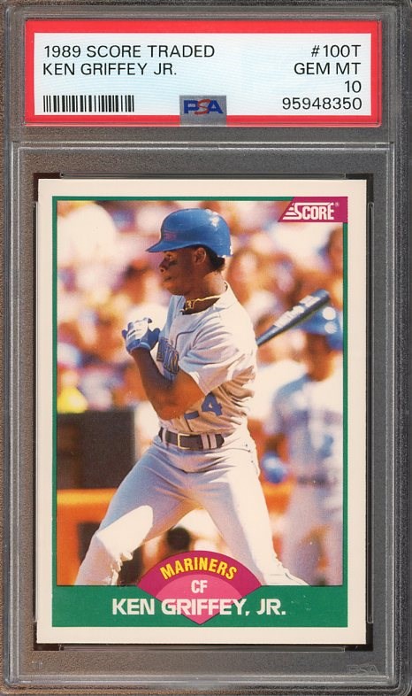 1989 Score Traded Ken Griffey, Jr. RC #100T  PSA Gem Mint 10 - A nice action shot of Griffey, Jr. batting highlights this 1989 Score issue.  This one is graded a PSA Gem Mint 10 and comes in a scratch free holder.