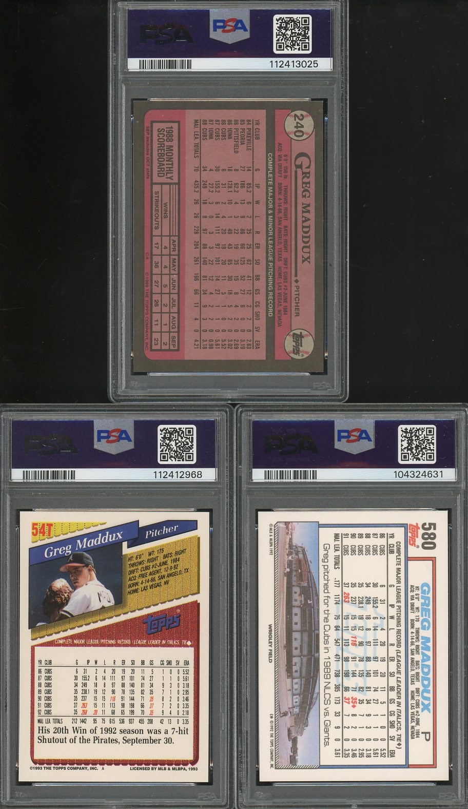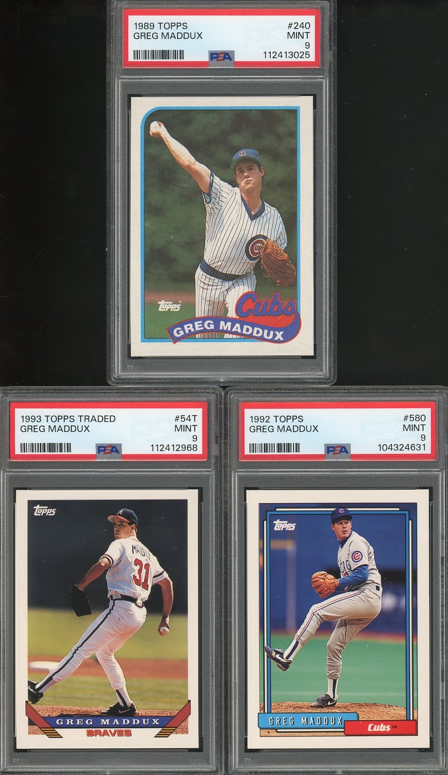 Greg Maddux 1989 Topps #240, 1992 Topps #580, and 1993 Topps Traded #54T, All in PSA Mint 9's - A quick way to add three graded cards to your Hall of Fame collection.