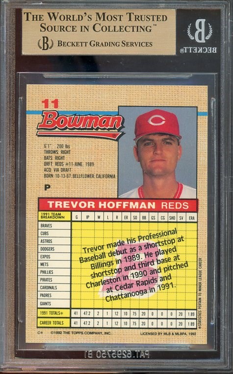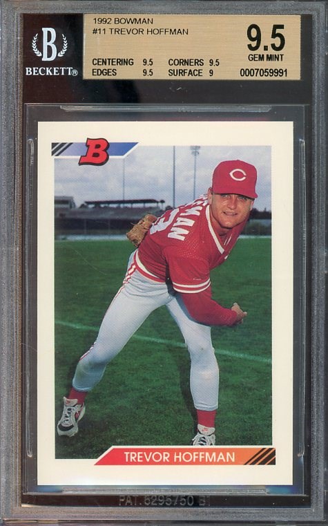 1992 Bowman Trevor Hoffman RC #11 BGS Gem Mint 9.5 - Hoffman racked up an incredible 601 saves during his career, second to only Mariano Rivera. Quite a feat considering he played for the Padres and not the Yankees.