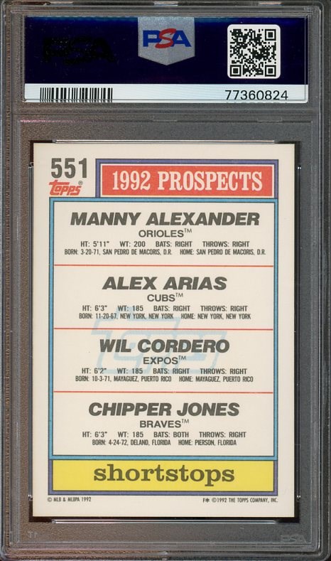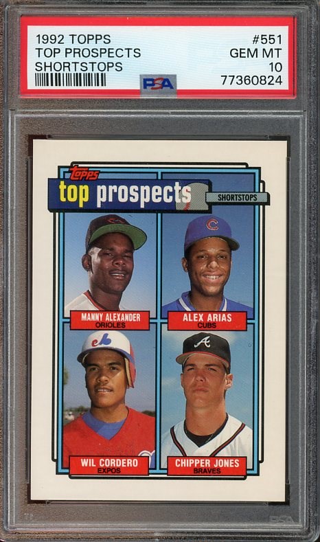 1992 Topps Chipper Jones #551 PSA Gem Mint 10 - A very early card on Chipper Jones and in PSA Gem Mint 10 grade. Jones ended his career in 2012 as arguably one of the best third baseman in history with a .303 career batting average, 468 home runs, and 1,623 runs batted in.