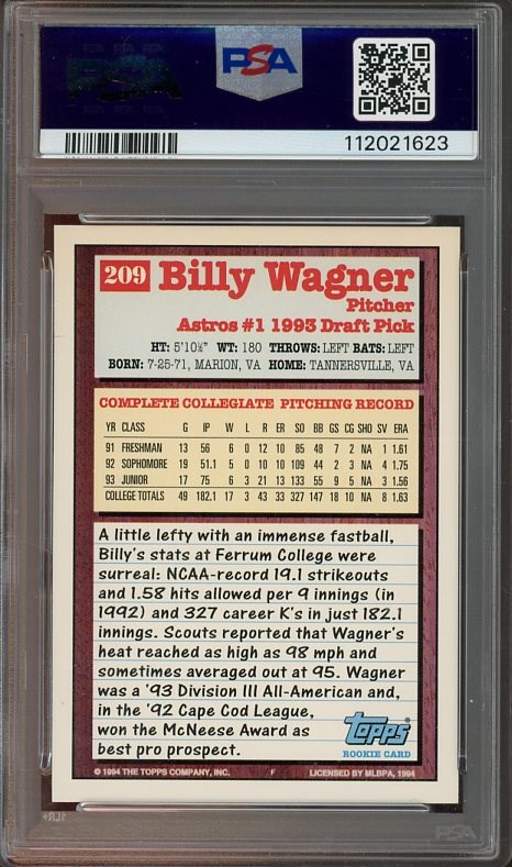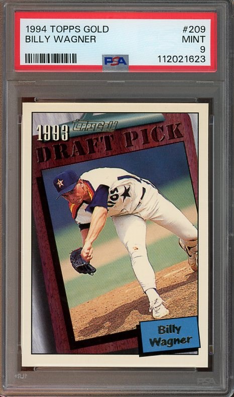 1994 Topps Gold Billy Wagner RC #209 PSA Mint 9 - This is the tougher Topps Gold parallel of Wagner's first Topps release. Card was recently graded and comes in a new PSA holder. Wagner was recently elected to the Hall of Fame.