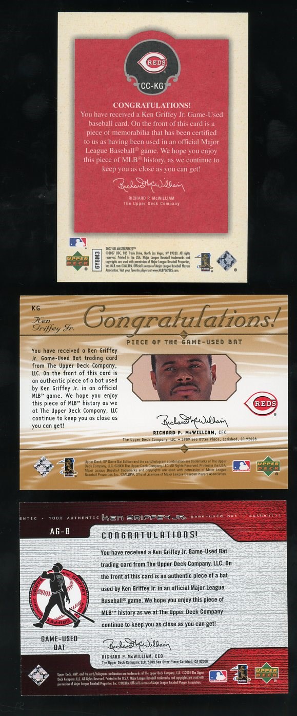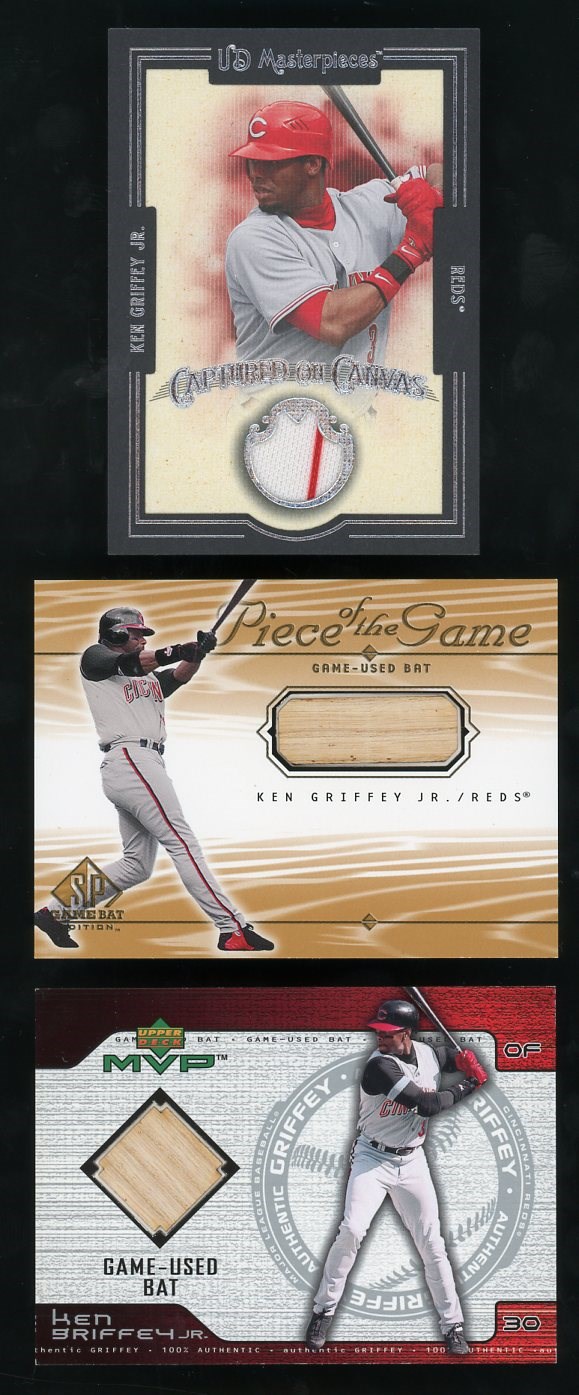 Lot of 3 Different Ken Griffey, Jr. Game Used Jersey Cards - Lot includes his 2001 SP Game Used Edition Game Jersey #KG-M, 2001 Upper Deck Legends Legendary Game Jerseys #J-KG, and 2001 SP Authentic UD Exclusives Game Jersey #UD-KG