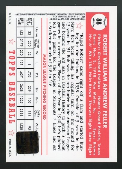 2001 Topps Archives Reserve Bob Fleer Autograph - A great looking Feller autograph signed on the front of his 1952 Topps design. NM or better.