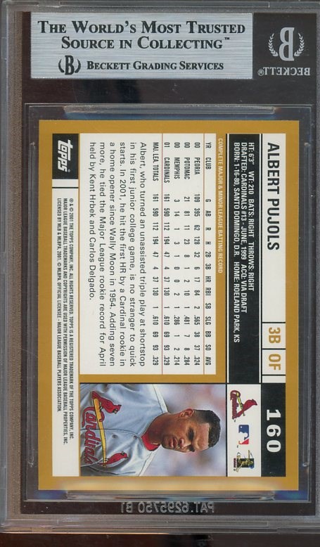 2002 Topps Albert Pujols #160 HTA (with Correct Back Photo) BGS NM/MT+ 8.5 - A low population card issued in the Home Team Advantage sets, plus is the tougher correct back photo variation. (The more common version has Polanco's photo on the back.) Starting this one at just $10.