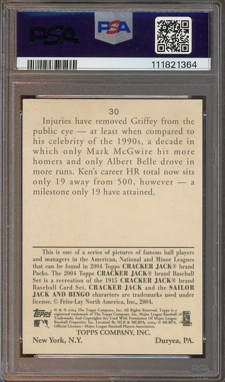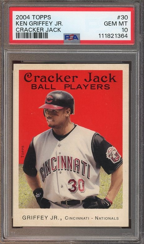 2004 Topps Cracker Jack Ken Griffey, Jr. #30 PSA Gem Mint 10 - A fun card with a great design, this Cracker Jack Griffey, Jr. is popular with collectors and has only 45 PSA 10's in the population.