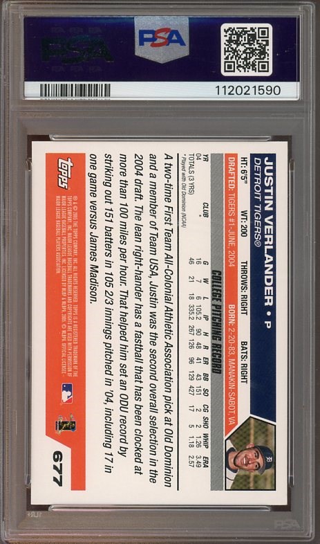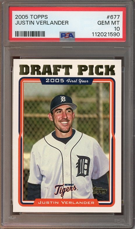 2005 Topps Justin Verlander RC #677  PSA Gem Mint 10 - Verlander is a future first ballot Hall of Famer, so picking up his 2005 Topps rookie in advance, would be a good idea.  Card was recently graded and comes in a new PSA holder.