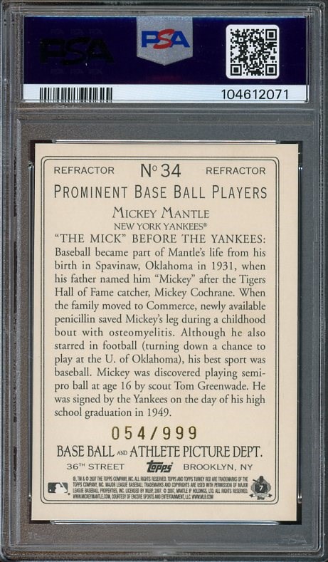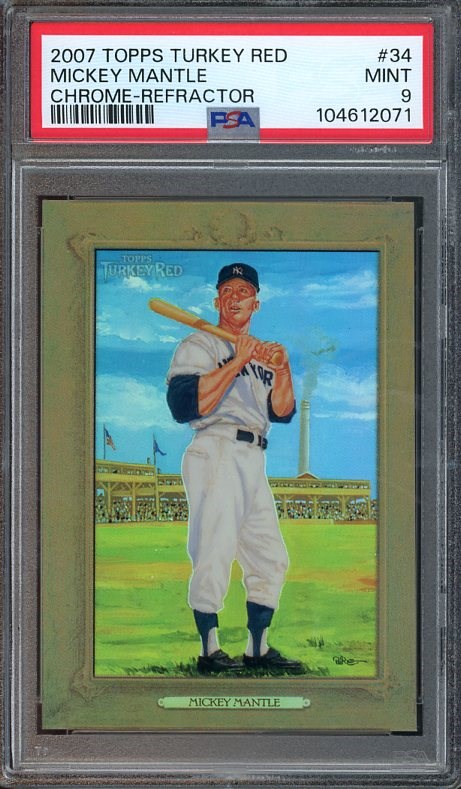 2007 Topps Turkey Red Chrome Refractor Mickey Mantle #34 PSA Mint 9 (Pop 6) - The PSA population is 6 PSA 9's with just 2 graded higher. The refractors are serial numbered out of 999 made.