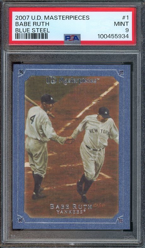 2007 Upper Deck Masterpieces Babe Ruth #1 Blue Steel #'d/50  PSA Mint 9 - A low population card, this attractive parallel also features Lou Gehrig and is serial #34/50 made.