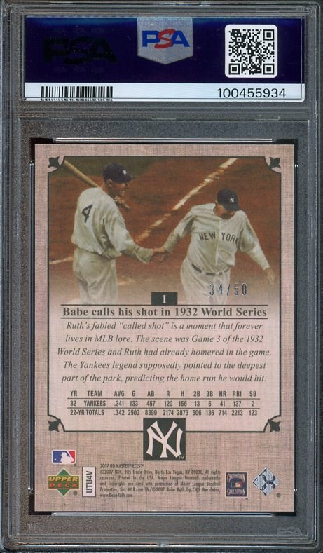 Lot # 453: 2007 Upper Deck Masterpieces Babe Ruth #1 Blue Steel #'d/50 PSA Mint 9