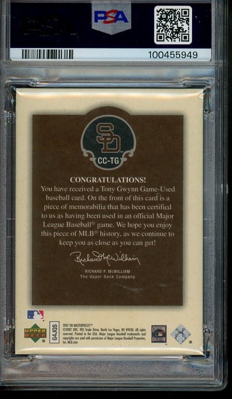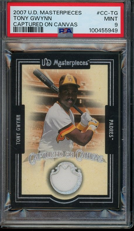 2007 Upper Deck Masterpieces Tony Gwynn Captured On Canvas Game Jersey #TG PSA Mint 9 (Pop 2) - A low population of just two PSA 9's with only one graded higher.