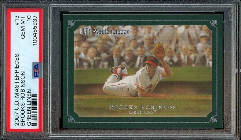 2007 Upper Deck Masterpieces Brooks Robinson Green Linen #13  PSA Gem Mint 10 (Pop 1) - A great looking card of Robinson making a diving catch.  Card was recently graded and comes in a new PSA holder.