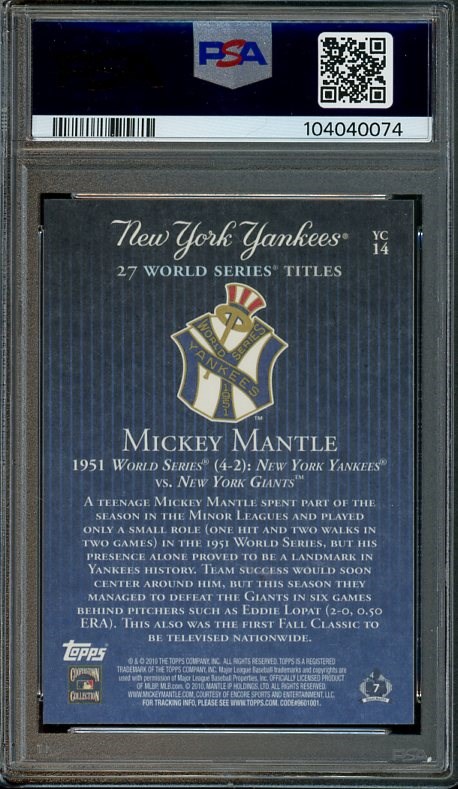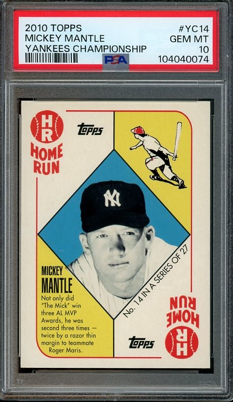 2010 Topps Yankees Championship Mickey Mantle #YC14 PSA Gem Mint 10 (Pop 7) - Here is a low population PSA 10 of "the Mick" that few Mantle collector's own. The card was recently graded and comes in a new PSA holder.