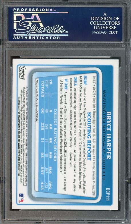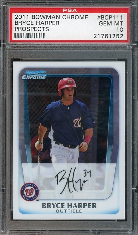 2011 Bowman Chrome Prospects Bryce Harper RC #BCP111 PSA Gem Mint 10 - This is Harper's second appearance in the 2011 Bowman Chrome Prospects set, with the other being card #BCP1.  The #111 actually has a lower PSA population (nearly half) making it a bit of a sleeper card to own on Harper.