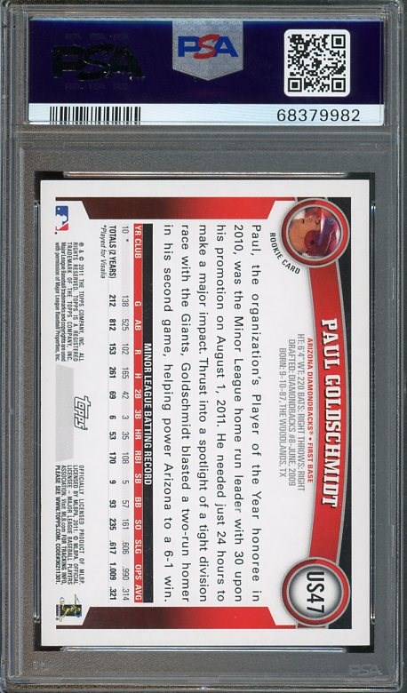 2011 Topps Update Paul Goldschmidt RC #US47  PSA Gem Mint 10 - This is one of his better rookie cards, as it came out in the limited production, 2011 Topps Update product.