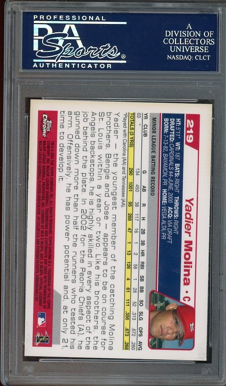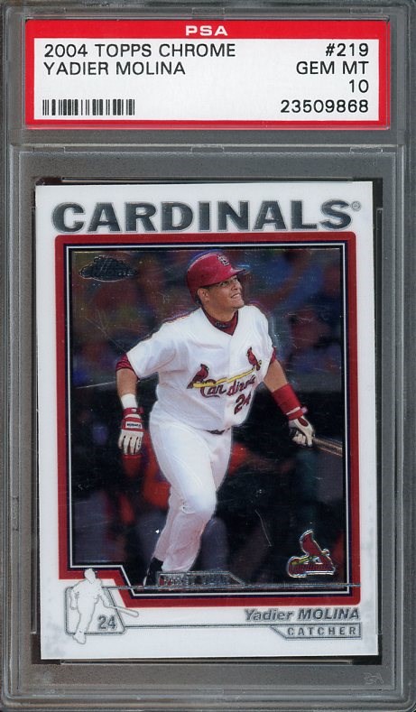 2004 Topps Chrome Yadier Molina RC #219  PSA Gem Mint 10 - A tough card to find in a PSA 10, this one is a beauty of future HOFer Molina.  A huge fan favorite in St. Louis, Molina will be eligible for the HOF in 2028.