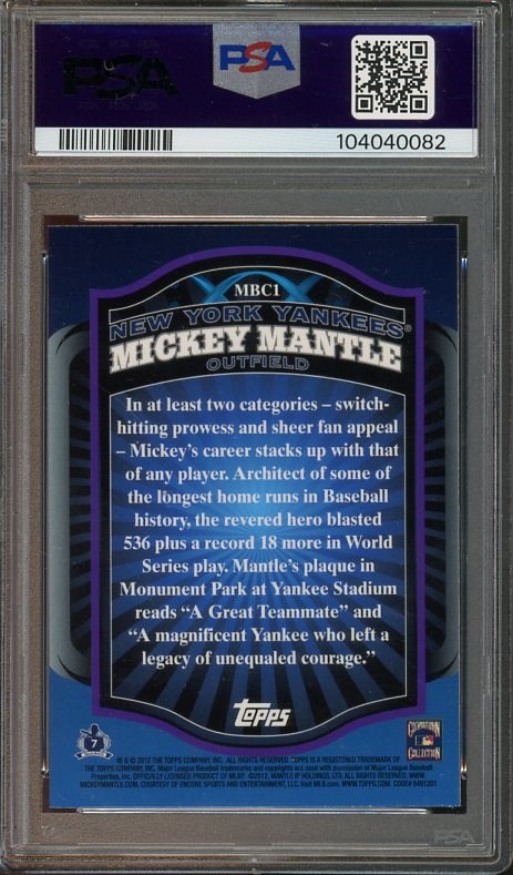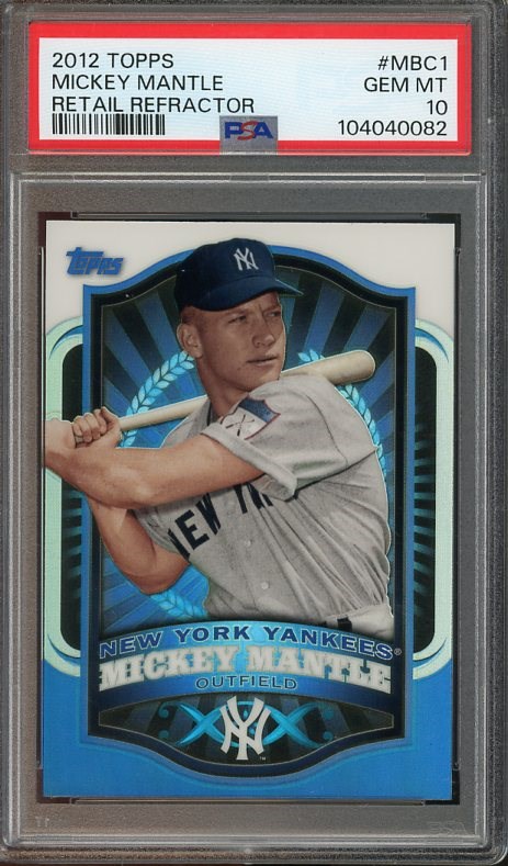 2012 Topps Mickey Mantle Retail Refractor #MBC1 PSA Gem Mint 10 - An early photo of Mantle was used on this 2012 Topps issue. The blue design paired with being a refractor makes this a very attractive card.