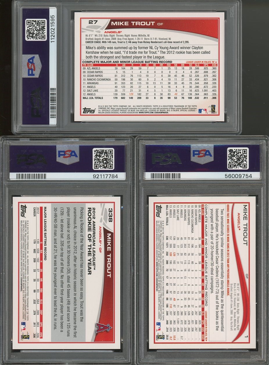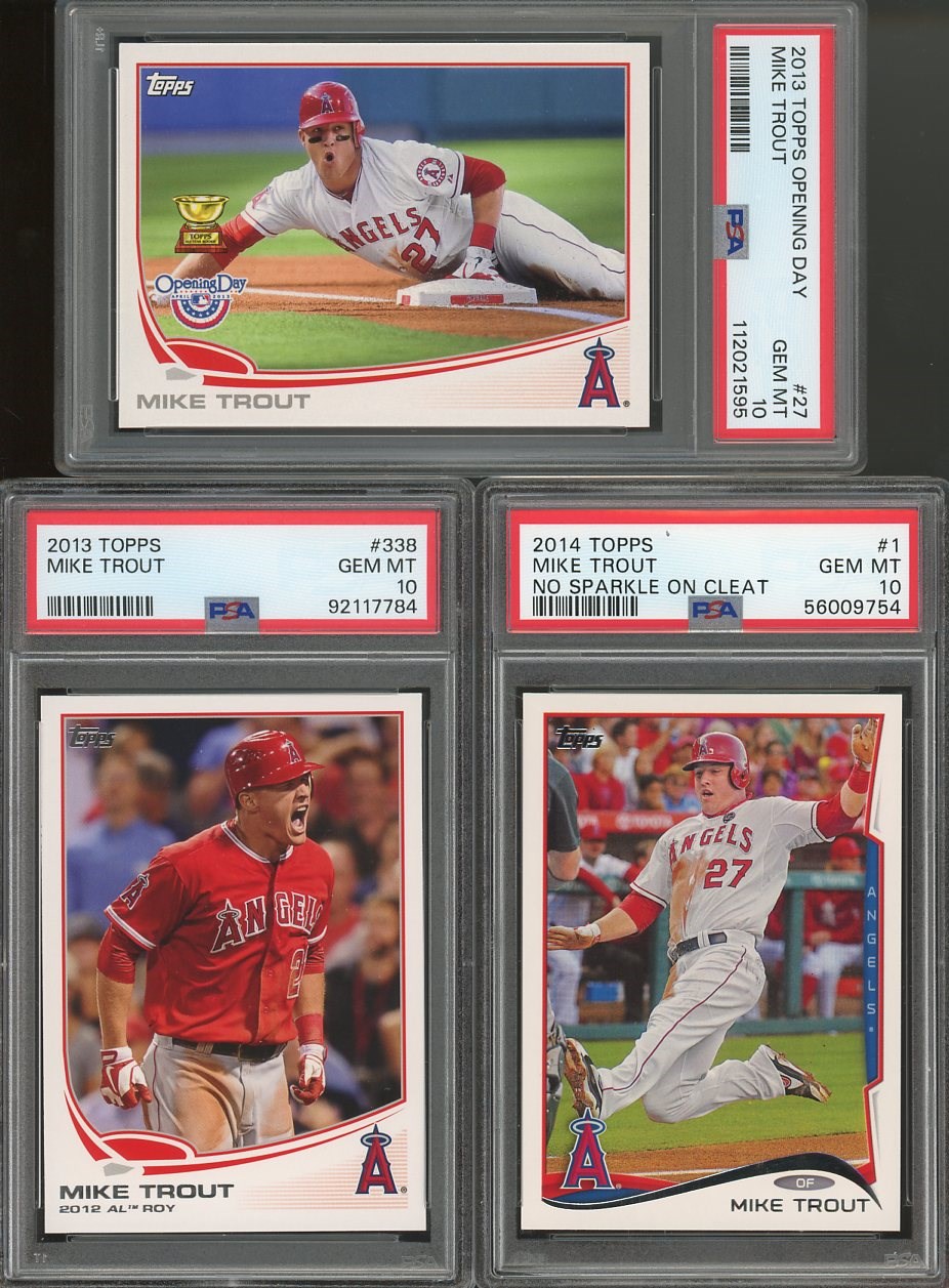 Lot of 3 Different Mike Trout Cards All in PSA Gem Mint 10's - Lot includes his 2013 Topps #338, 2013 Topps Opening Day #27 and 2014 Topps #1 (No Sparkle on Cleat).  All three cards are in scratch free PSA holders.
