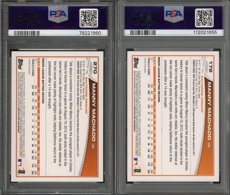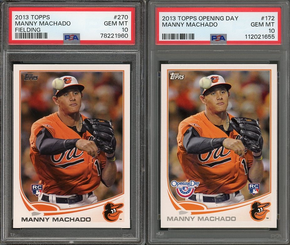 Manny Machado 2013 Topps RC #270 and 2013 Topps Opening Day RC #172 Both in PSA Gem Mint 10's - At age 33 Machado already has over 2,000 hits and 362 home runs. His rookie cards are poised to take off if he can continue his production to age 40.