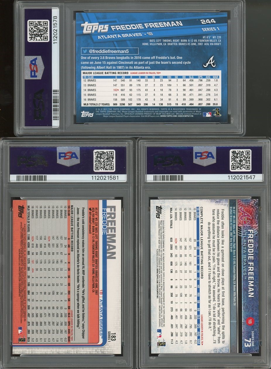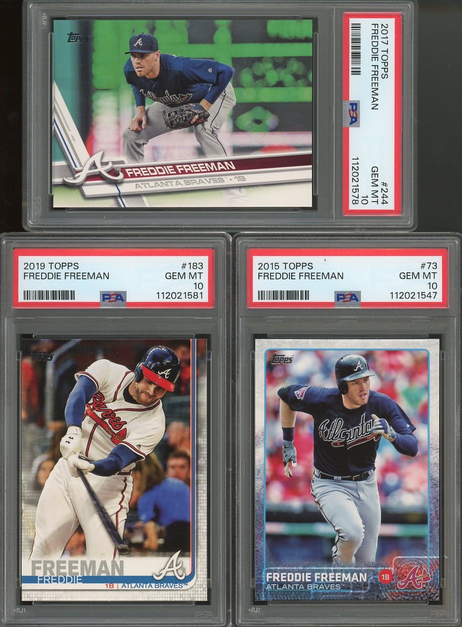 Lot of 3 Freddie Freeman Cards All in PSA Gem Mint 10's - Lot includes his 2015 Topps #73, 2017 Topps #244, and 2019 Topps #183. All three cards come in new PSA holders.