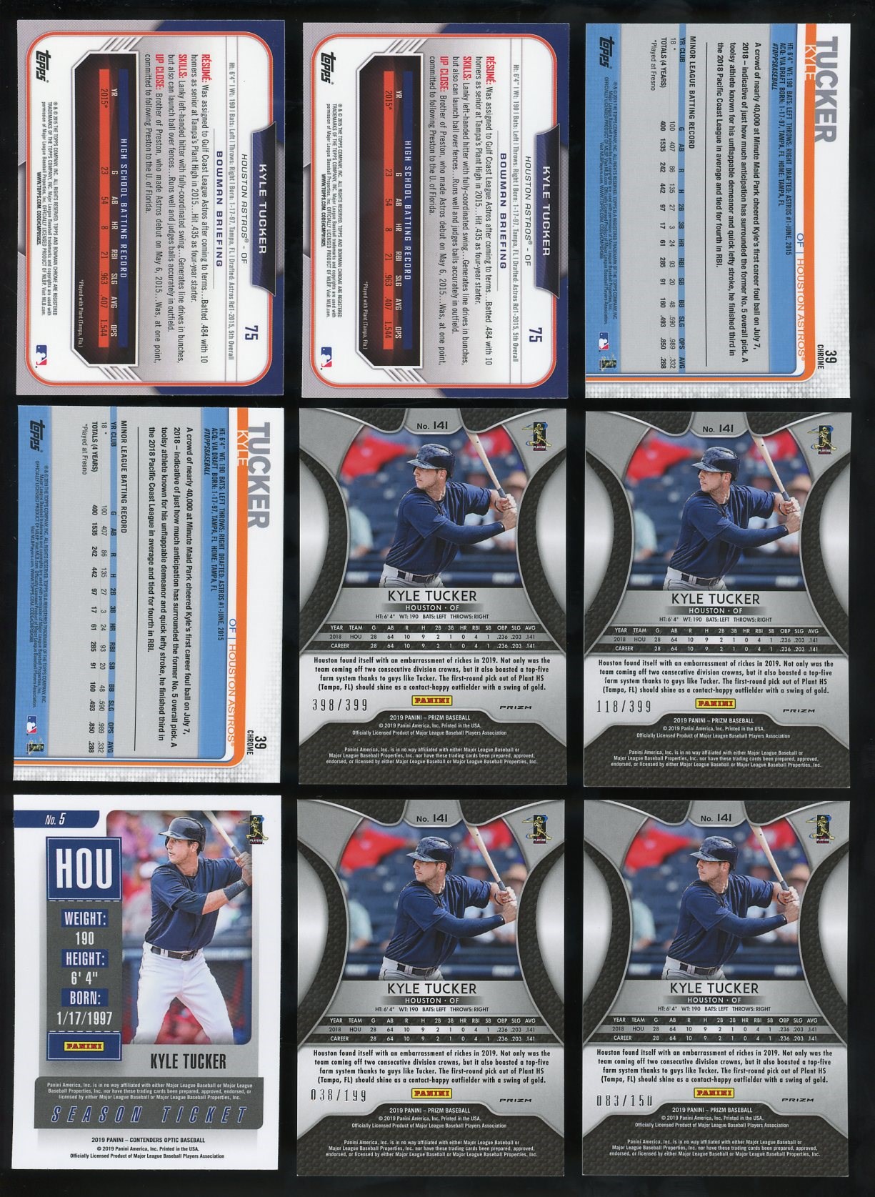 Lot of 9 Kyle Tucker Rookie Cards - Includes (2) 2015 Bowman Chrome #75, (2) 2019 Topps Chrome #39, (2) 2019 Panini Prizm Blue Mojo Prizm #141 #'d/399, 2019 Panini Prizm Green Donut Circles Prizm #141 #'d/199, 2019 Panini Prizm Gold Donut Circles Prizm #141 #'d/150, and 2019 Panini Chronicles Contenders Optic #5.  Cards are NM/MT or better.