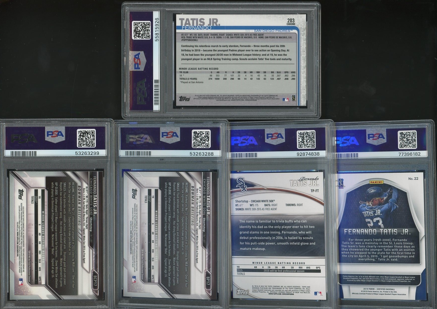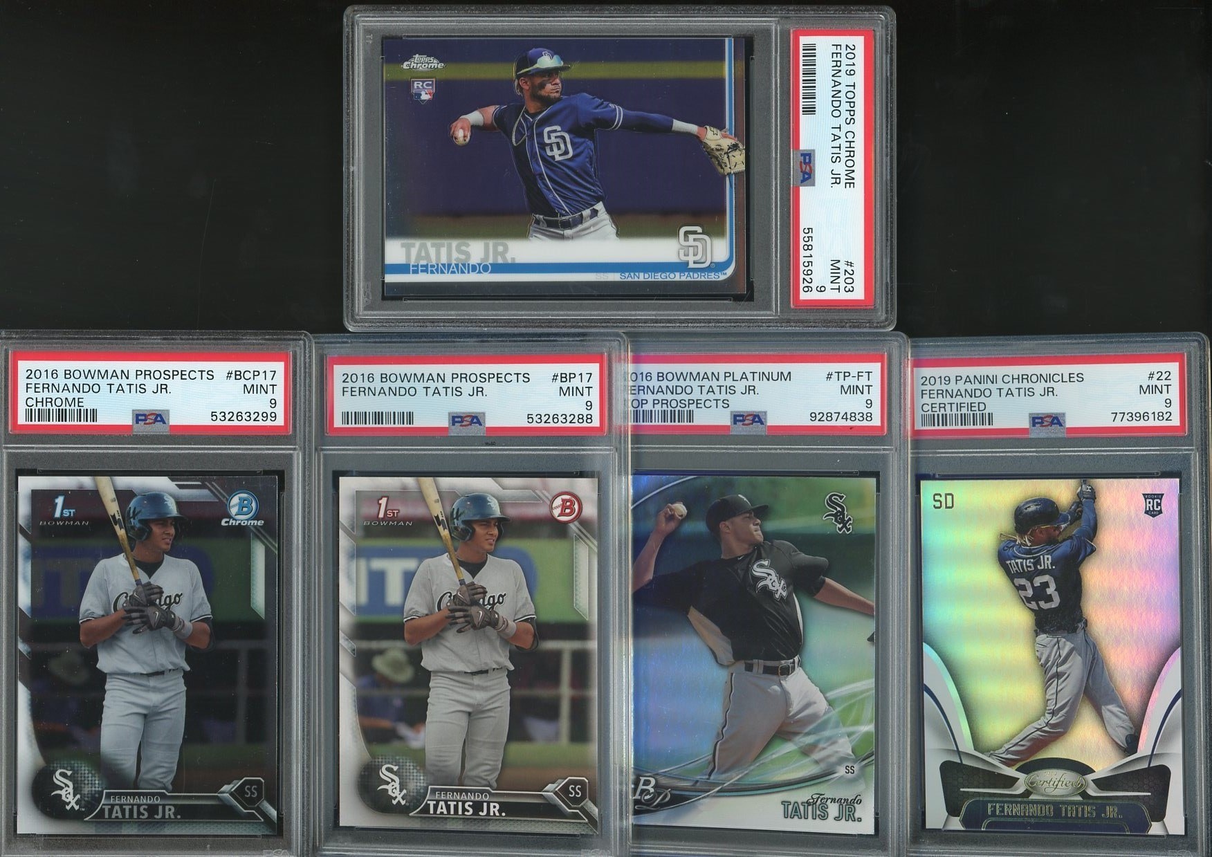 Lot of 5 Different Fernando Tatis, Jr. Rookies All in PSA Mint 9's - Lot includes 2016 Bowman Prospects #BP17, 2016 Bowman Chrome Prospects #BCP17, 2016 Bowman Platinum Top Prospects #FT, 2019 Panini Chronicles Certified #22, and 2019 Topps Chrome #203.