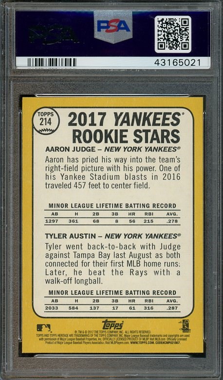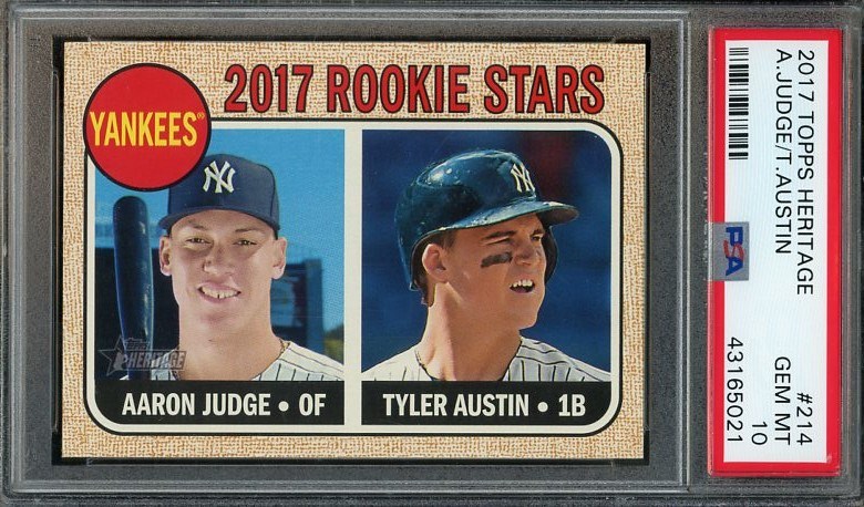 2017 Topps Heritage Aaron Judge RC #214 PSA Gem Mint 10 - Topps went "Old School" with this two-player 1968 design featuring Tyler Austin along with Judge. This is one of Judge's more affordable rookies in PSA 10 grade.