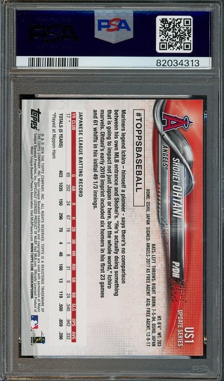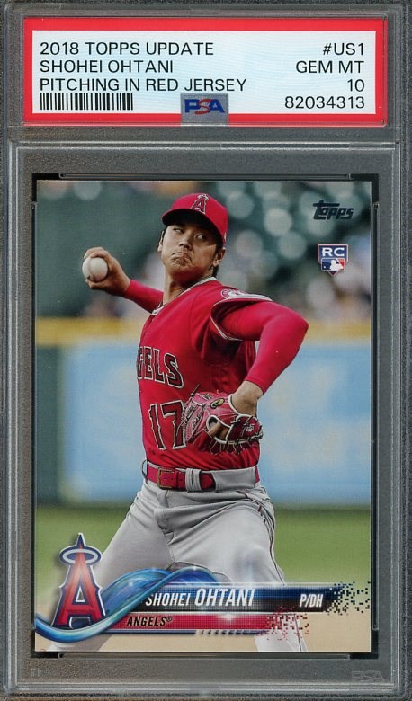 2018 Topps Update Shohei Ohtani RC (Pitching) #US1 PSA Gem Mint 10 - This card is the Pitching in Red Jersey version of the 2018 Topps Update set and is graded Gem Mint 10 by PSA.