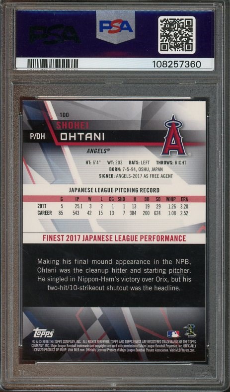 2018 Finest Shohei Ohtani RC #100 PSA Gem Mint 10 - The Finest rookie has a lower population of PSA 10's than several of other Ohtani rookies. Be sure to add one to your collection.