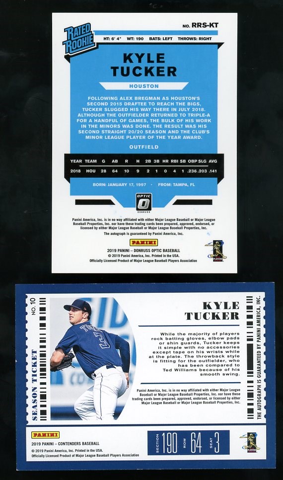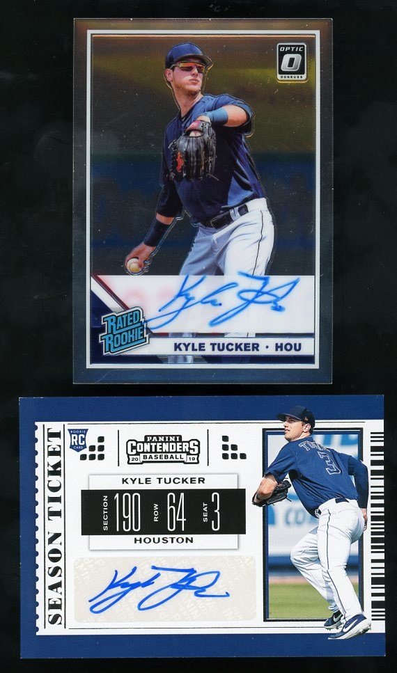 Lot of 2 Different Kyle Tucker 2019 Rookie Autographs - Get his 2019 Donruss Optic Rated Rookie Autograph #RRS-KT and his 2019 Panini Contenders Season Ticket RC Autograph #10.  Both cards are NM/MT or better.