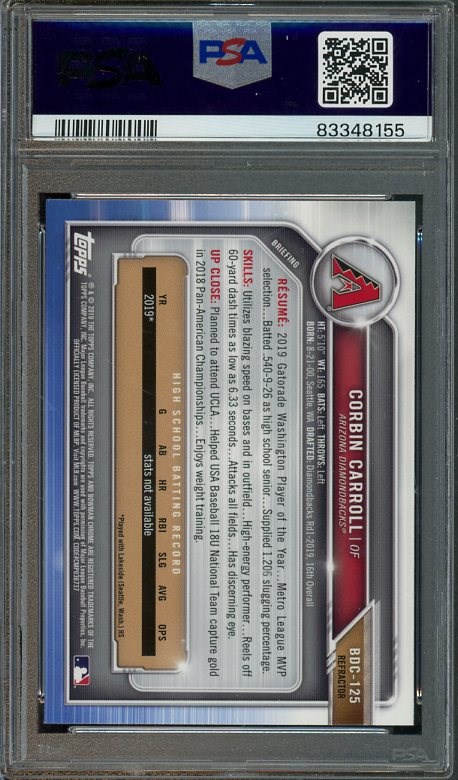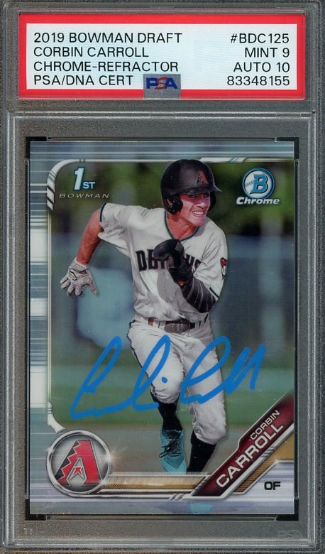 2019 Bowman Draft Chrome Refractor Corbin Carroll RC #BDC125 Autographed PSA 9 (with PSA 10 Auto.) - Signed in a light blue ink, the autograph really stands out on the Corbin Carroll rookie card. Mint card with a Gem Mint auto!