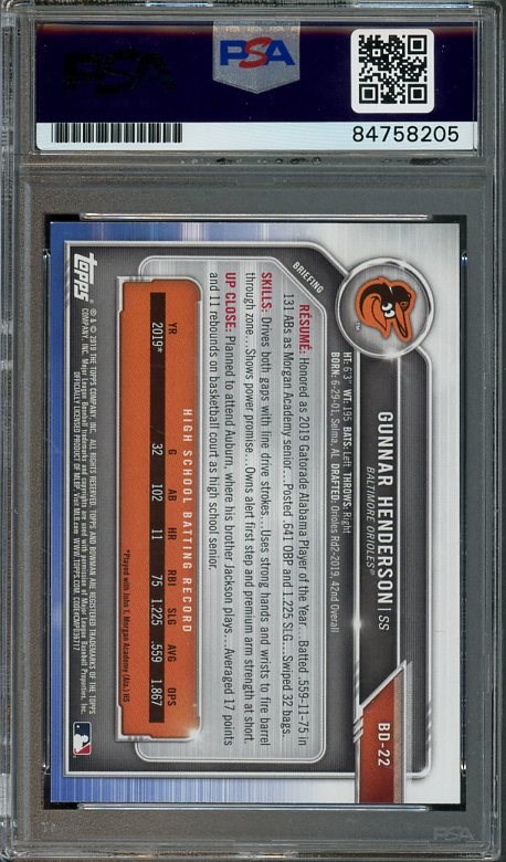 2019 Bowman Draft Gunnar Henderson RC #BD22 Autographed  PSA/DNA Authentic - Here is the rookie card from 2019 Bowman signed by Gunnar Henderson.  The autograph is authenticated by PSA/DNA.
