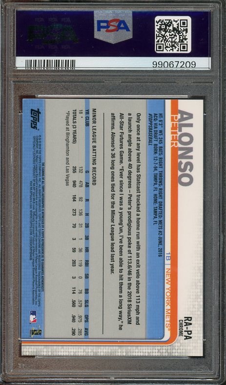 2019 Topps Chrome Pete Alonso Rookie Autographs #RA-PA PSA Mint 9 - Here is a great rookie autograph of the Mets' star Pete Alonso. The card features an on-card autograph from 2019 Topps Chrome and is graded PSA Mint 9