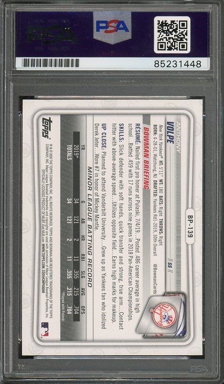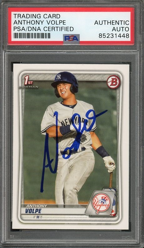 2020 Bowman Prospects Anthony Volpe RC #BP139 Autographed PSA/DNA Authentic - Here is Volpe's 2020 Bowman rookie card autographed in blue sharpie. The signature has been authenticated by PSA/DNA and comes in a scratch free holder.