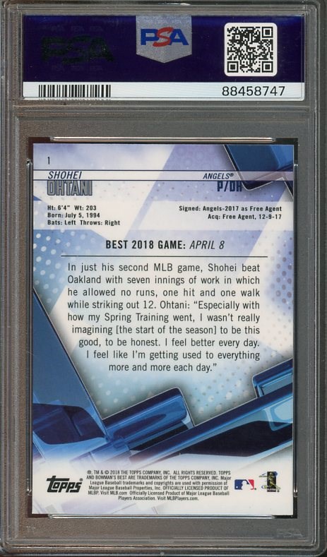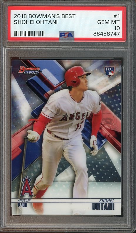 2018 Bowman's Best Shohei Ohtani RC #1 PSA Gem Mint 10 - A great looking card of Ohtani at bat, this 2018 Bowman's Best has been a red hot card recently.