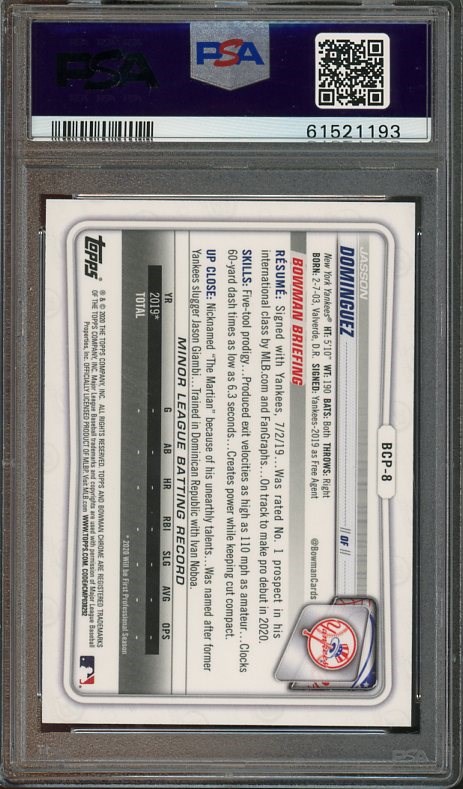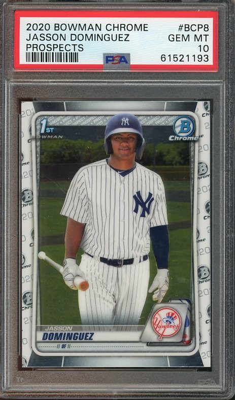 2020 Bowman Chrome Prospects Jasson Dominguez RC #BCP8  PSA Gem Mint 10 - Dominguez has become part of the starting line up for the Yankees in 2024 showing off his future potential.  Starting bid is just $15.