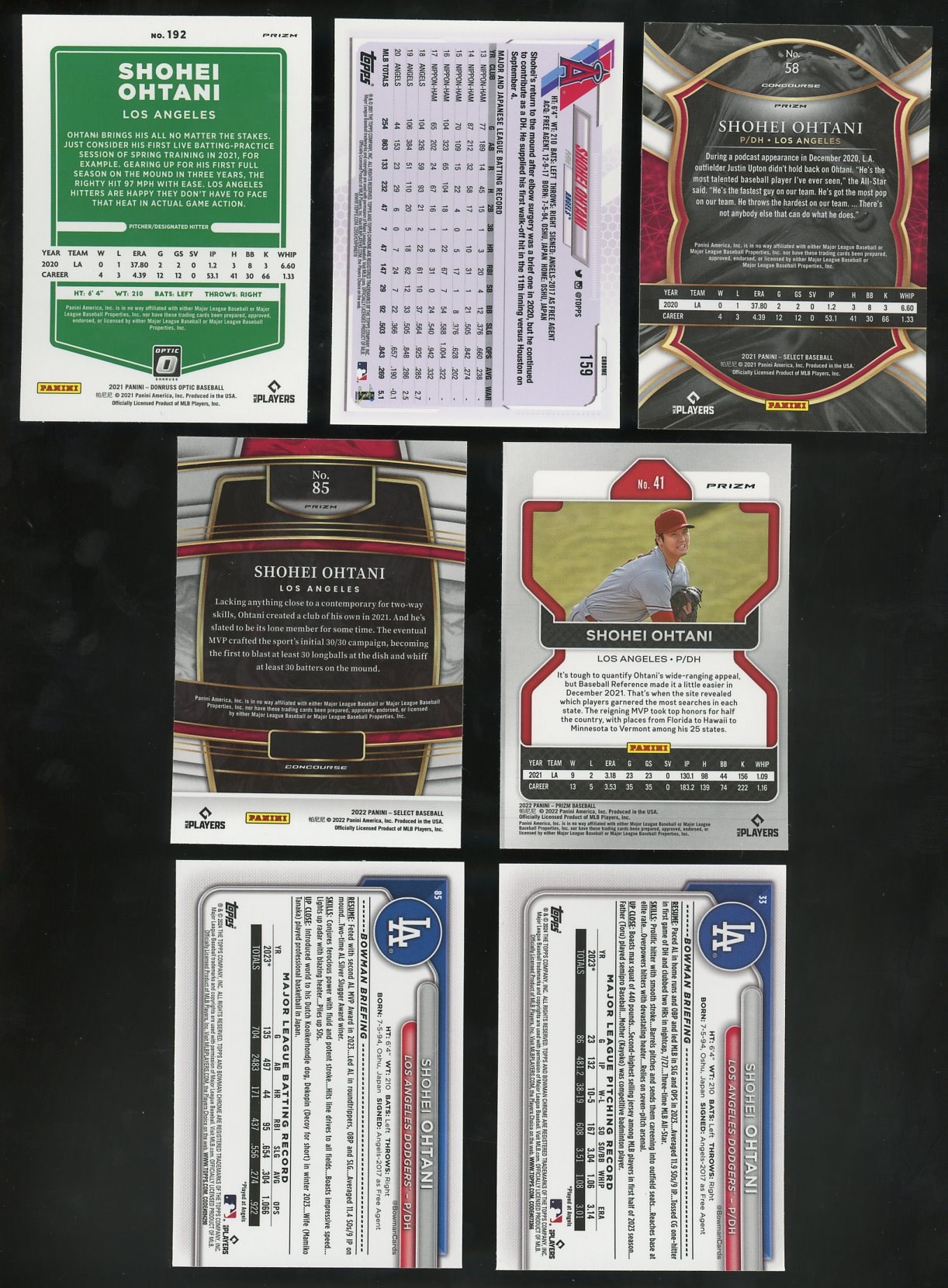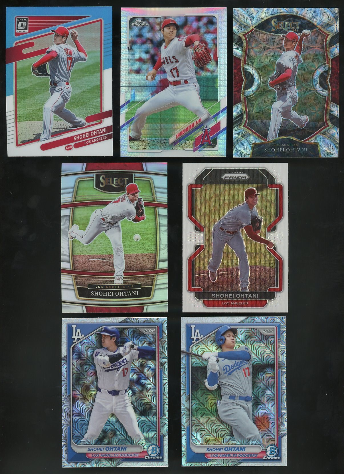 Lot of 7 Different Shohei Ohtani Refractor/Prizm Parallels - Includes his 2021 Donruss Optic Carolina Blue Prizm #192, 2021 Topps Chrome Hyper Prism #159, 2021 Select Scope Prizm #58, 2022 Select Scope Prizm #85, 2022Panini Prizm White Wave #41, 2024 Bowman Chrome Mega Box #85, and 2024 Bowman Chrome Mega Box #33.  All are NM/MT or better.