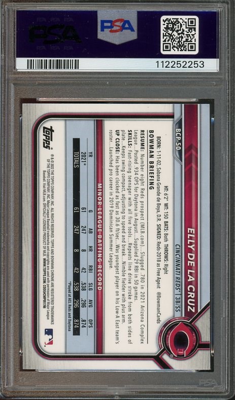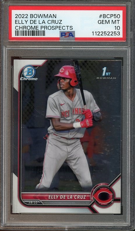 2022 Bowman Chrome Prospects Elly De La Cruz RC #BCP50 PSA Gem Mint 10 - One of his most popular rookies, here is the Bowman Chrome rookie of De La Cruz.  A problem free PSA 10 in a new PSA holder.