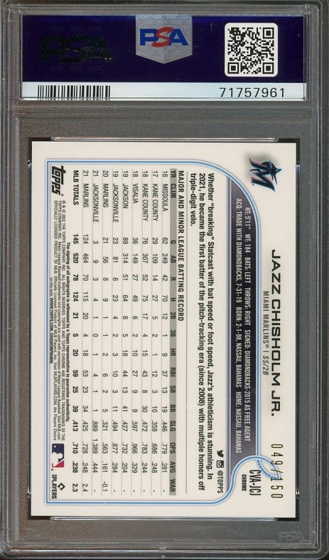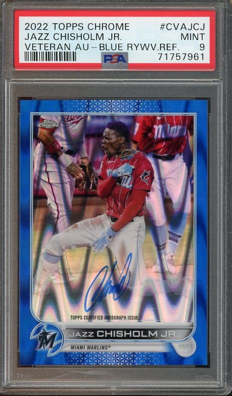 2022 Topps Chrome Jazz Chisholm Blue Raywave Refractor Autograph #'d/150 PSA Mint 9 - A very colorful card signed directly on the card by Chisholm, serial #49/150 produced.